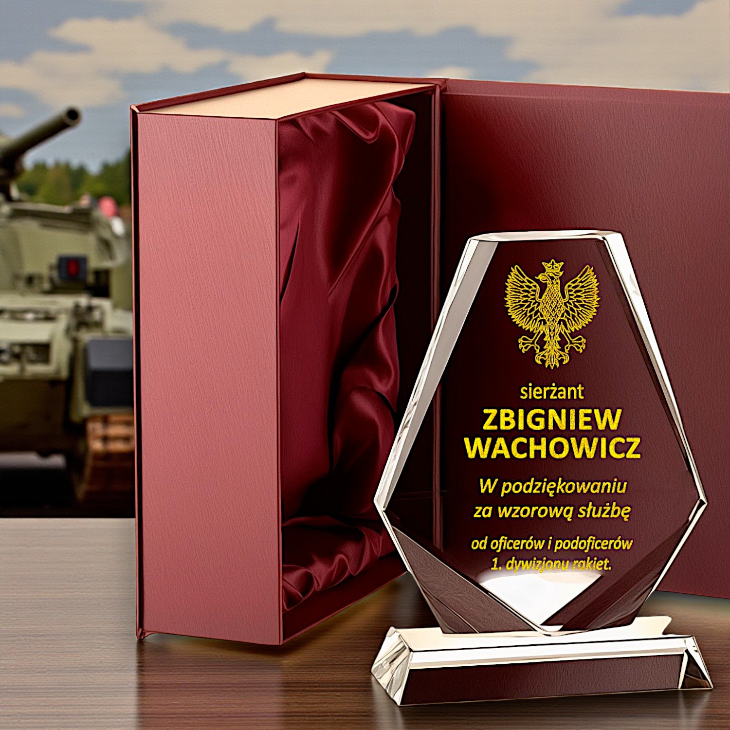 Ekskluzywny Grawerowany Kryształ w Ozdobnym Etui - Idealny na Jubileusz lub Awans dla Żołnierza Pułkownika Generała Kapitana Komandora