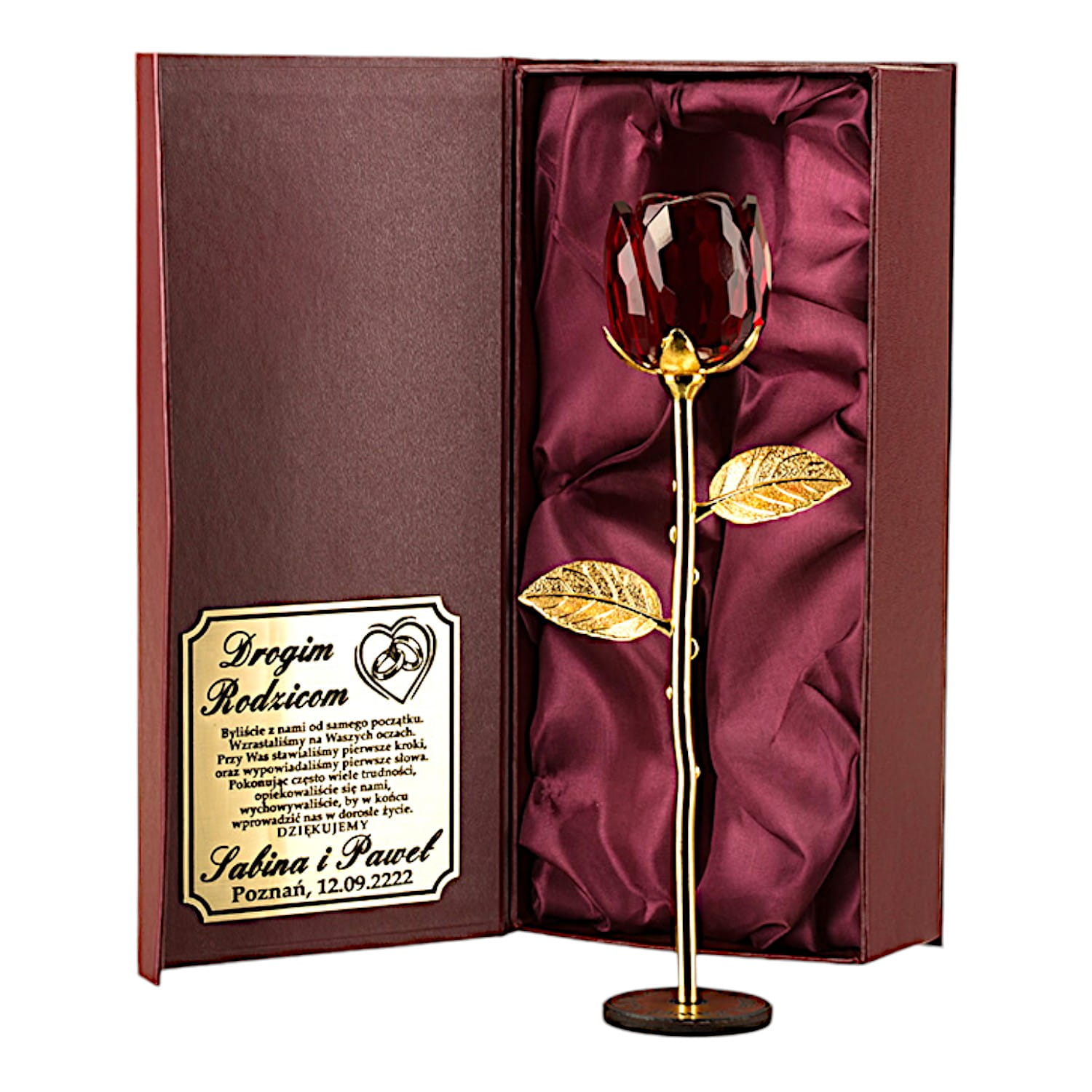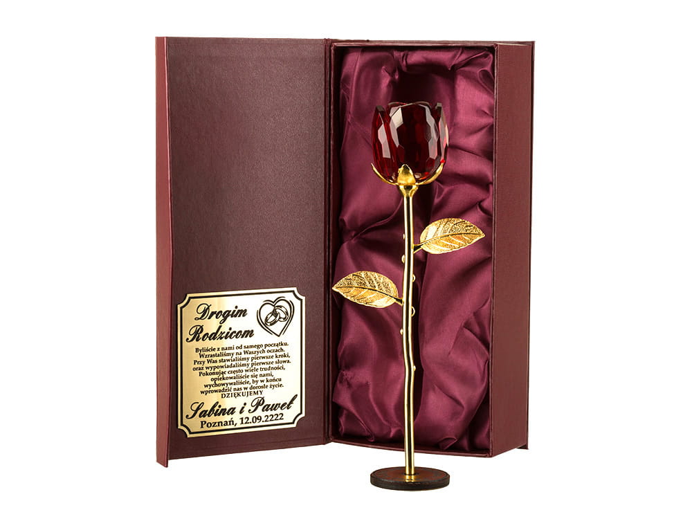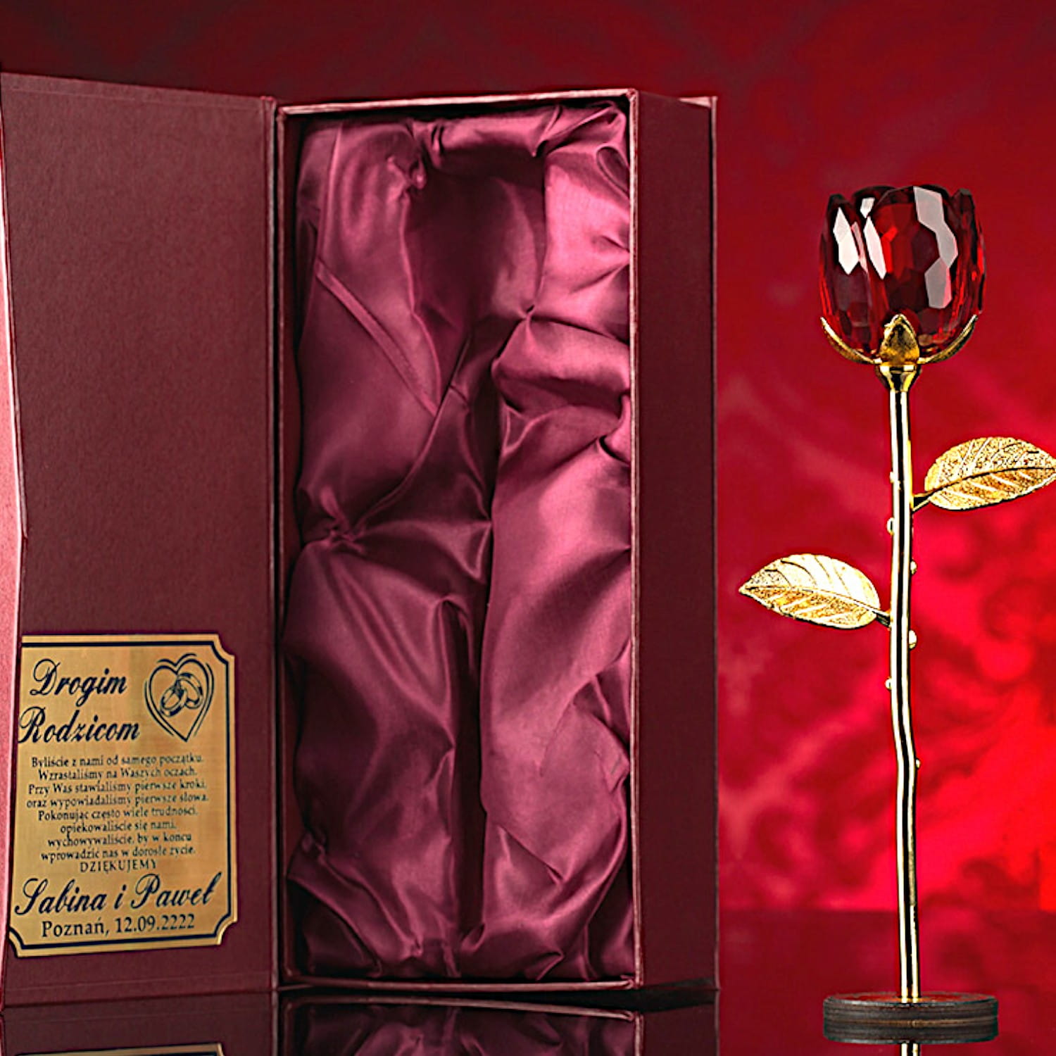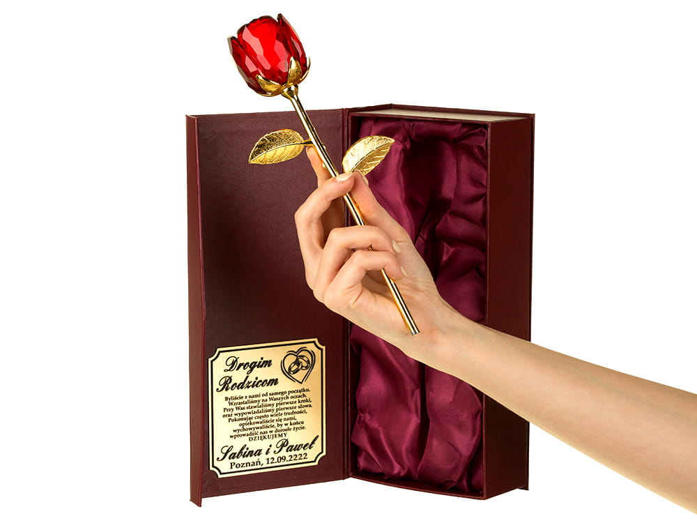Rzeczą wiadomą jest fakt, iż kwiaty potrafią czynić cuda. Są doskonałą formą podziękowań i przeprosin, najlepszym rozwiązaniem, jeśli chodzi o dodatek do życzeń, prezent na różnego rodzaju okazje. A co powiedzieliby Państwo na produkt, jakim jest kryształowa róża zapakowana w piękne etui, w którym znajdą się wygrawerowane słowa, jakie tylko chcieliby Państwo przekazać komuś ważnemu, bliskiemu, serdecznemu? Oryginalny prezent na Walentynki dla dziewczyny, niezwykle ciekawy pomysł, jeśli chodzi o podziękowania dla rodziców, dla świadków, dla dziadków, dla każdego. Kryształowe róże z podziękowaniami lub życzeniami, to bez wątpienia warte uwagi rozwiązania, które możemy zakupić z okazji różnego rodzaju świąt. Łodyga jest bogato zdobiona i wykonana z metalu.