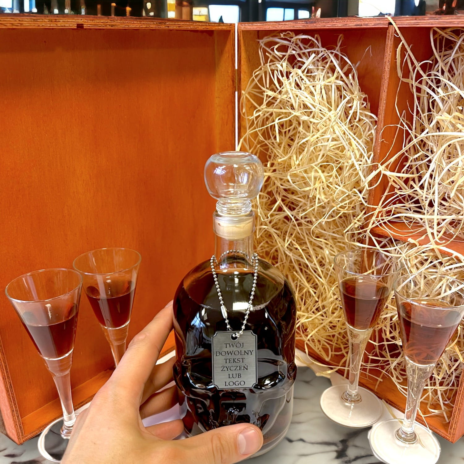 W zestawie z karafką otrzymasz korek, który gwarantuje uszczelnienie i długotrwałą świeżość zawartości. Dodatkowo, do karafki dołączony jest łańcuszek oraz tabliczka z personalizowaną dedykacją, która może być w kolorze złotym lub srebrnym. Nasza oferta zawiera również dowolną zmianę tekstu, dzięki czemu możesz dostosować dedykację do dowolnej okazji.