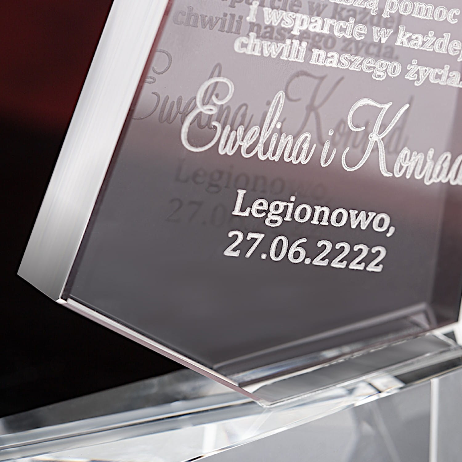 Cudowne kryształowa statuetka "krzywy obelisk" dla każdego. Idealne, jako podziękowanie dla rodziców, wyśmienite jako prezent na rocznicę ślub lub inne święto, w którym w oryginalny sposób chcemy przekazać ważnej nam osobie kilka cennych słów. Solidny, mocny, gruby kryształ w kształcie, na podstawce, z wygrawerowanym na nim tekstem, jaki tylko sobie zażyczymy. Prawda, że coś pięknego? Jeśli pomysły na prezent płynące prosto z serca, coś takiego, okaże się być wyborem perfekcyjnym.