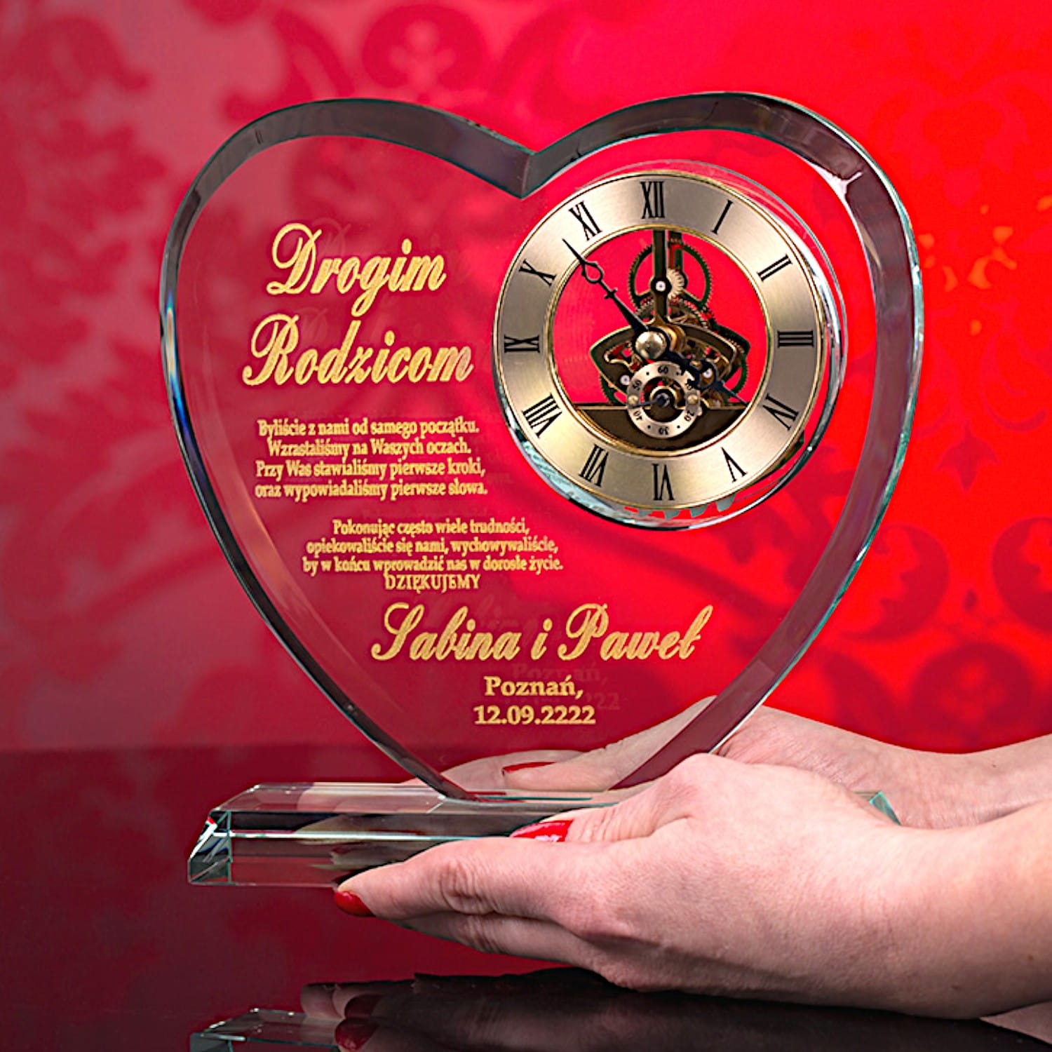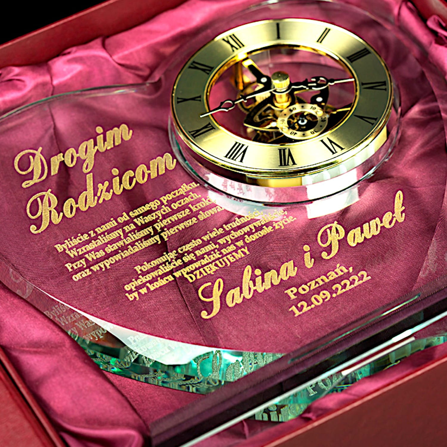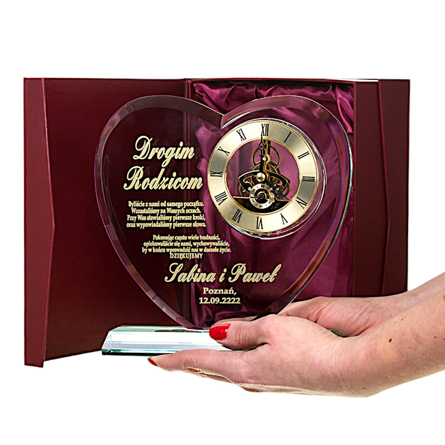 Szklane SERCE z dużym zegarem podziękowania dla rodziców dziadków świadków 1-99 urodziny rocznica ślubu
