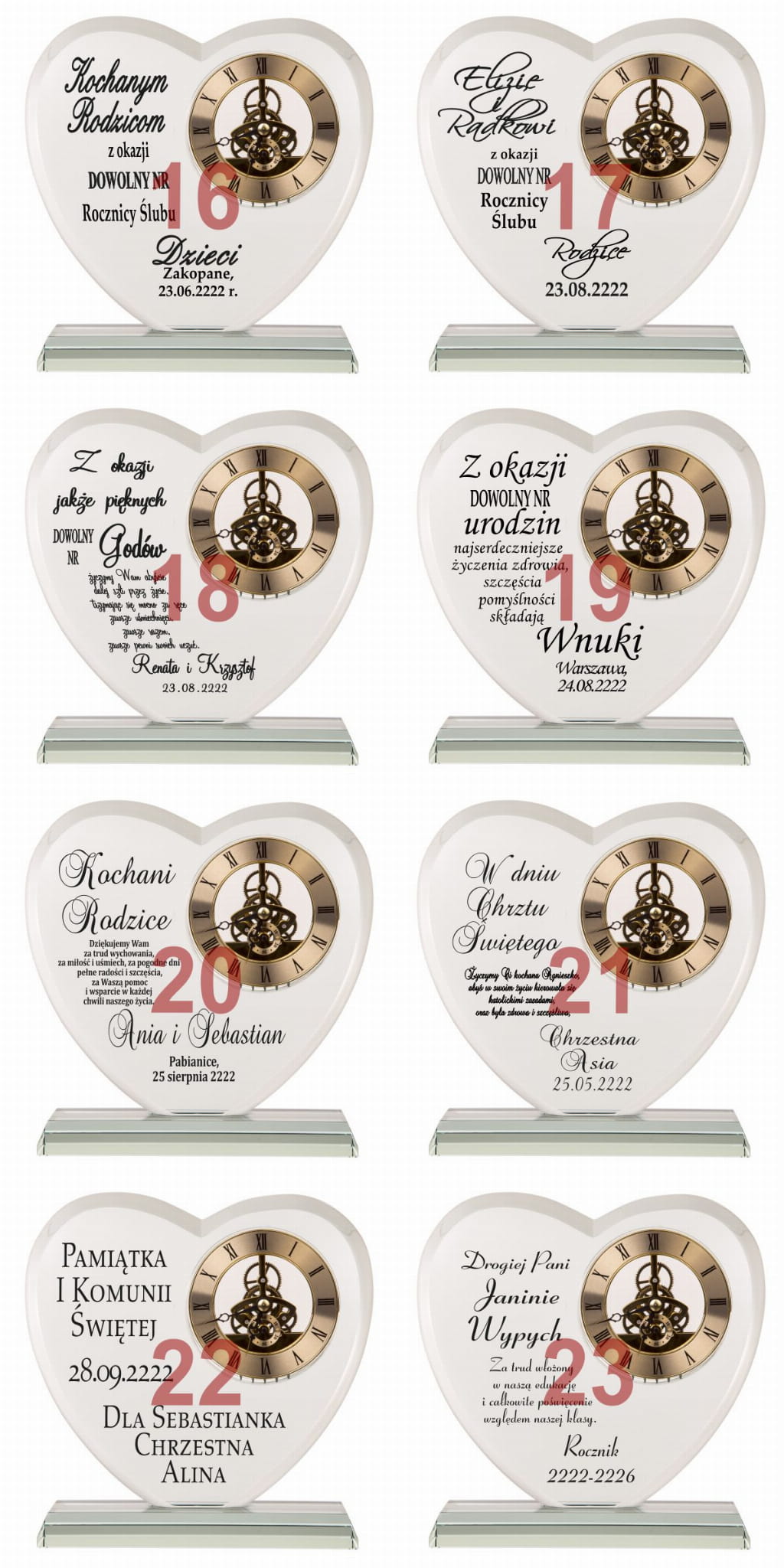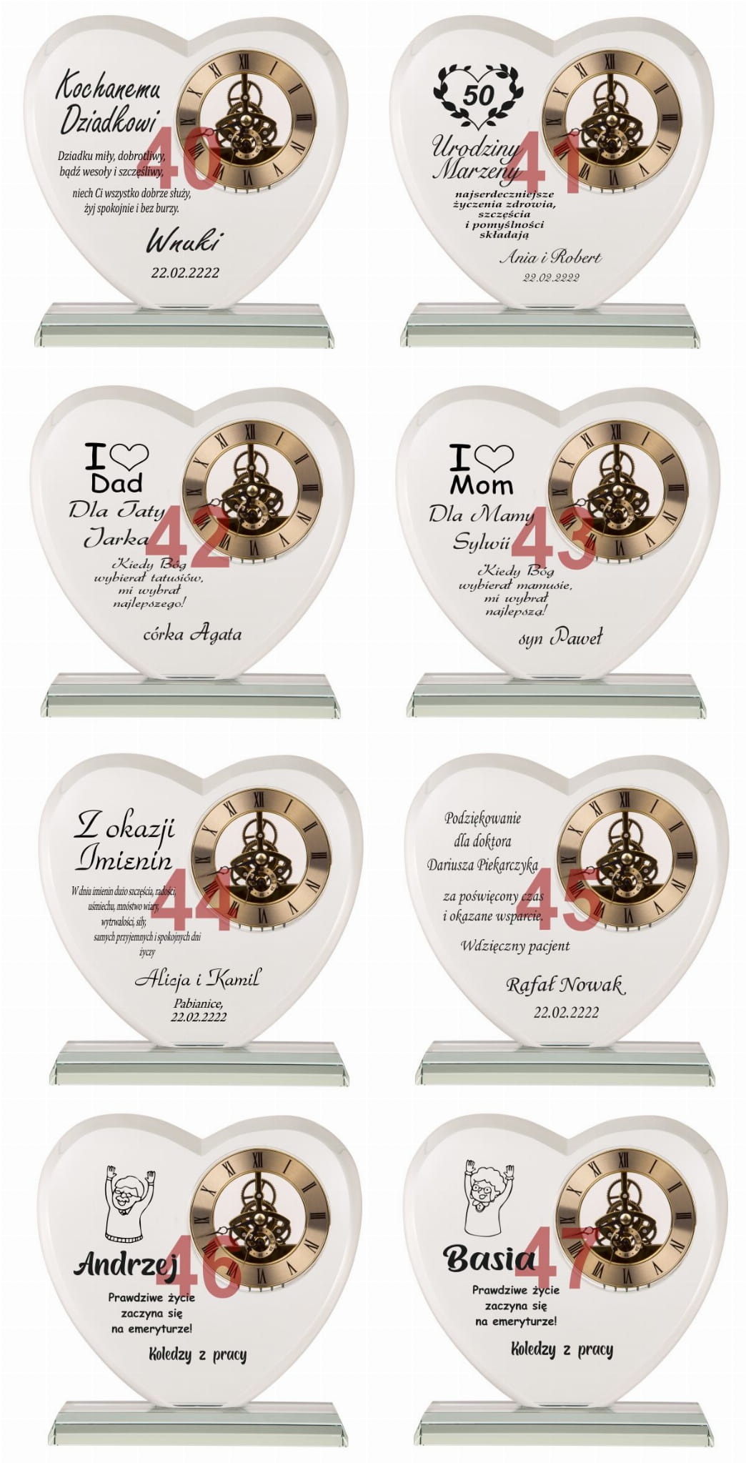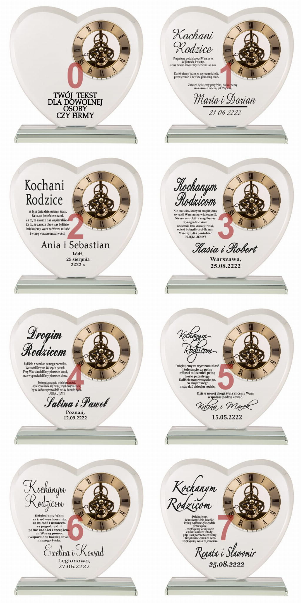 Szklane SERCE z dużym zegarem podziękowania dla rodziców dziadków świadków 1-99 urodziny rocznica ślubu